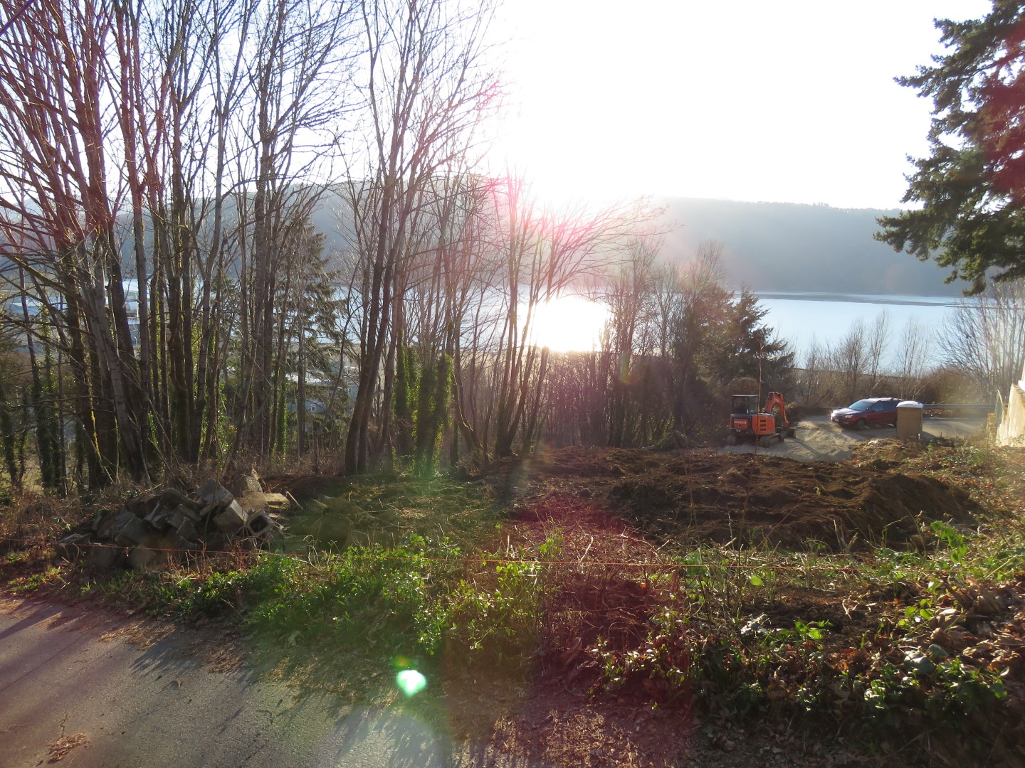 However, I'm now thrilled to report that, at last, we have started! The excavator has been working for three days. Our 'geotech' engineer has had a look at the dig and decided that we will also be needing a large retaining wall to ensure we don't migrate down the hill. We thought that might be the case, but, it still means a very heavy expense that's not usually required. We could have bought an easy, flat, boring lot but we think the attributes of this lot are worth the extra expense. We have a fabulous 180 degree view of the Alberni Inlet, a triple-sized City lot with services, unopened road allowances on two sides, laneway access at the rear and a cul-de-sac at the front. We can easily walk to shops/restaurants yet still feel we are living in a private, rural location.